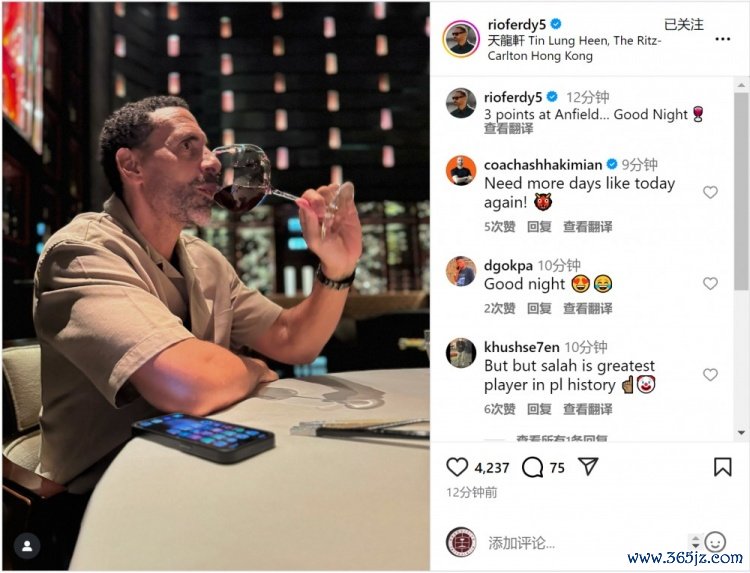 费迪南德晒喝红酒照片:在安菲尔德拿到3分,美妙的夜晚