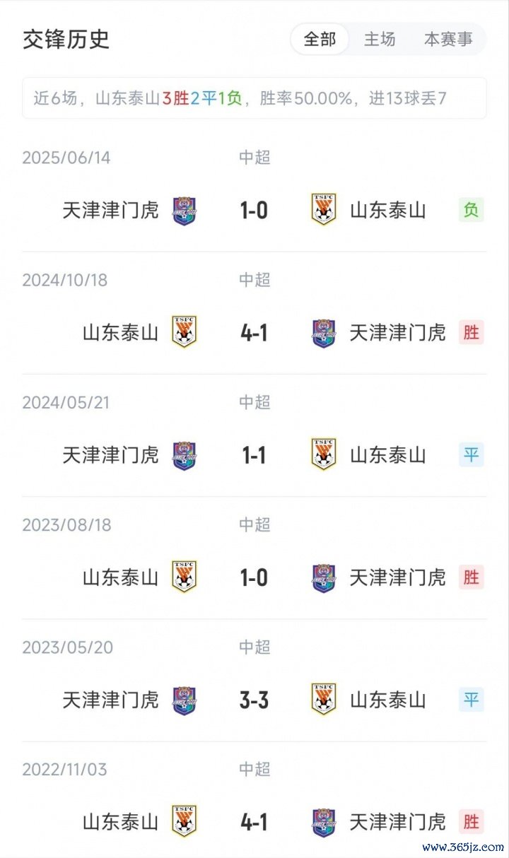 泰山暂列中超第5名,13胜8平7负积47分;津门虎紧随其后排在第6名,12胜8平8负积44分。