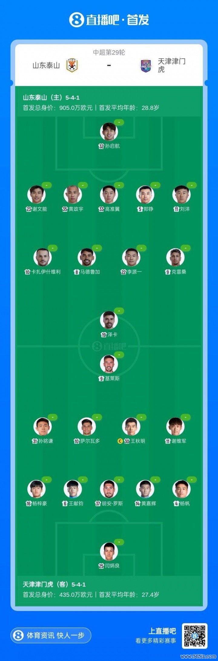 泰山vs津门虎首发:4外援PK3外援,王大雷伤缺,孙启航首秀